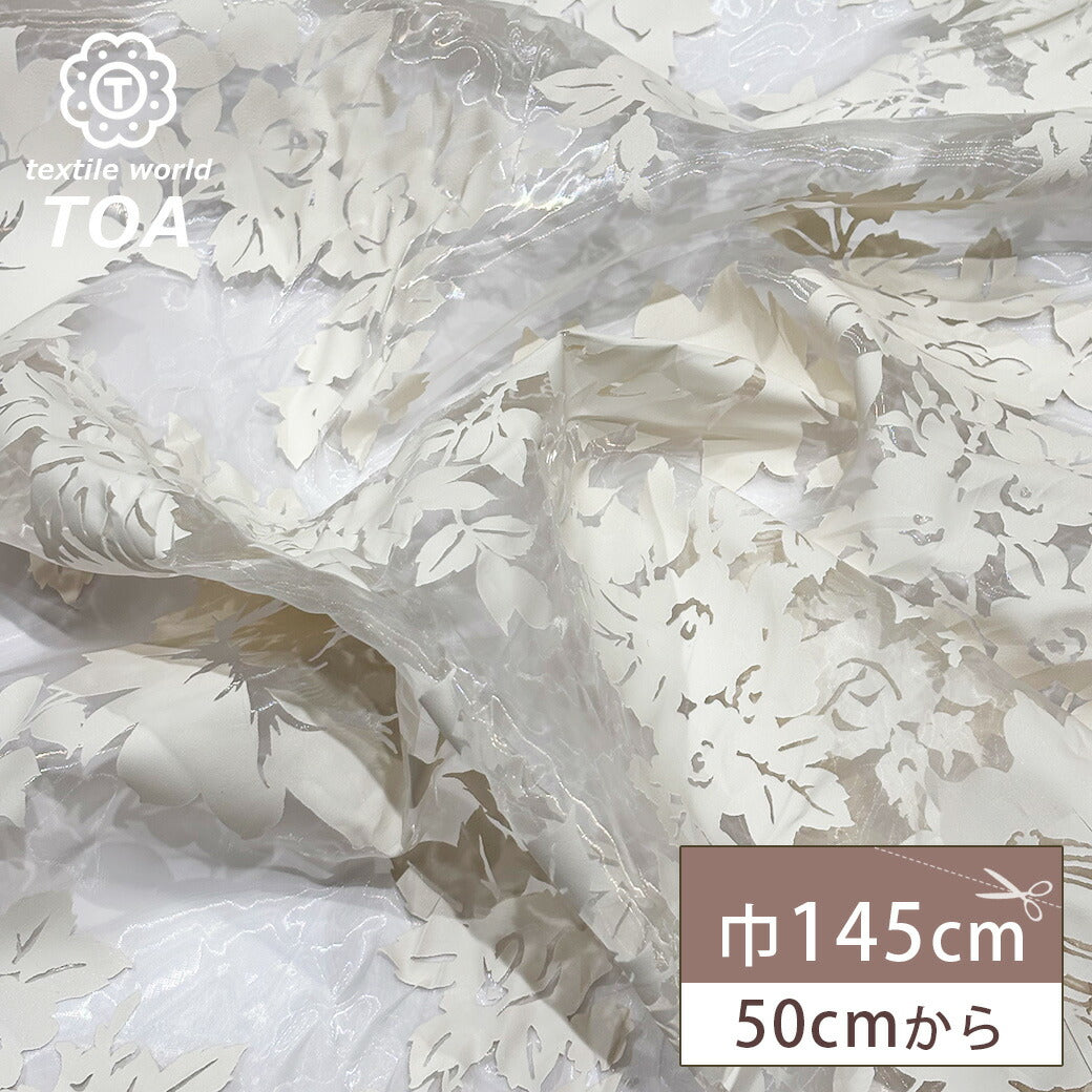 オーガンジー生地は透け感と張りのある質感が特徴で、ドレスやブラウス、舞台衣装などに多く用いられます。軽やかで上品な雰囲気を演出でき、重ね使いすると華やかさが増します。カラー展開も豊富で、フォーマルや装飾用に人気の高い素材です。