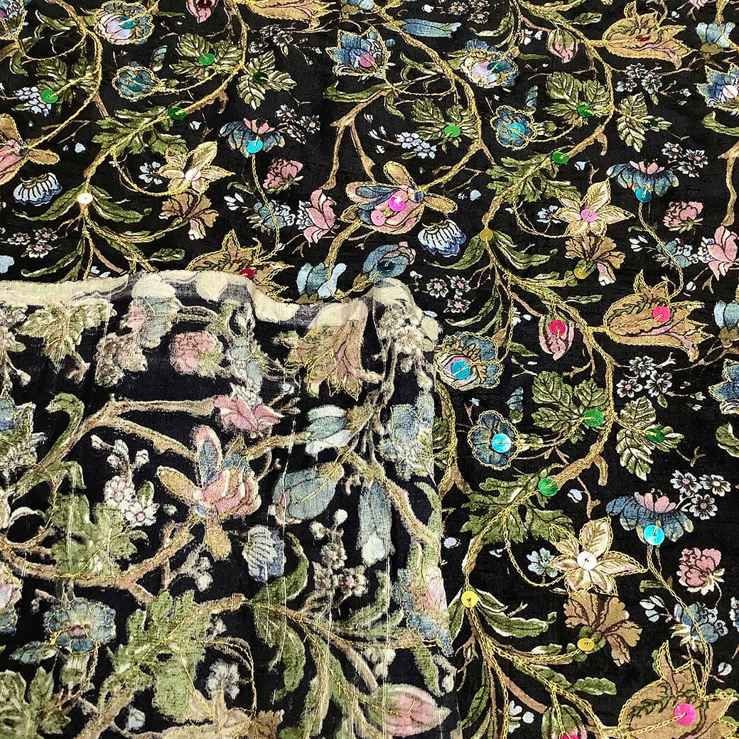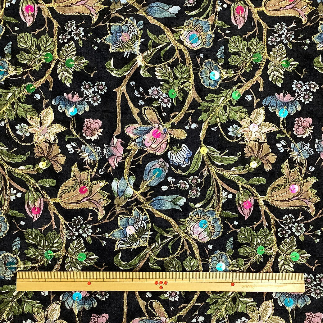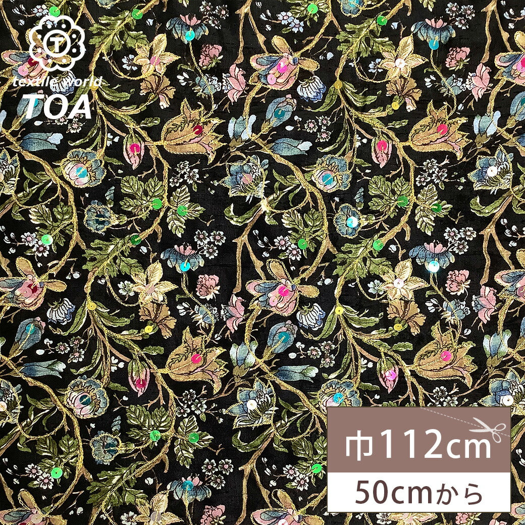 生地 【 シルク スパンコール フラワーネイビー 】 インドシルク 正絹 本絹 シルク生地 花柄 刺しゅう 刺繍生地 スパンコール キラキラ 民族衣装 サリー エスニック ベリーダンス アラブ衣装 伝統衣装 チョリ チュニック パンジャビ ダンス衣装 舞台衣装 Textile World TOA