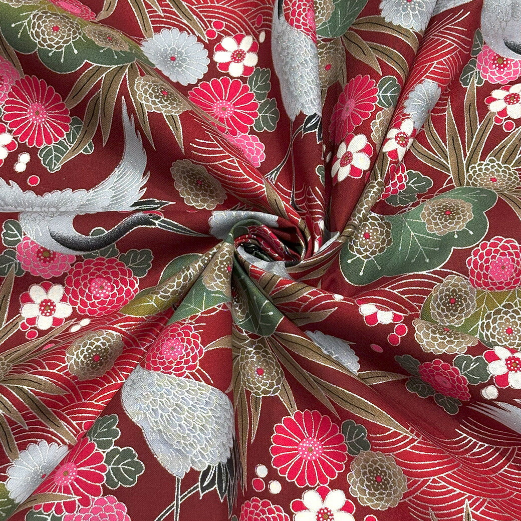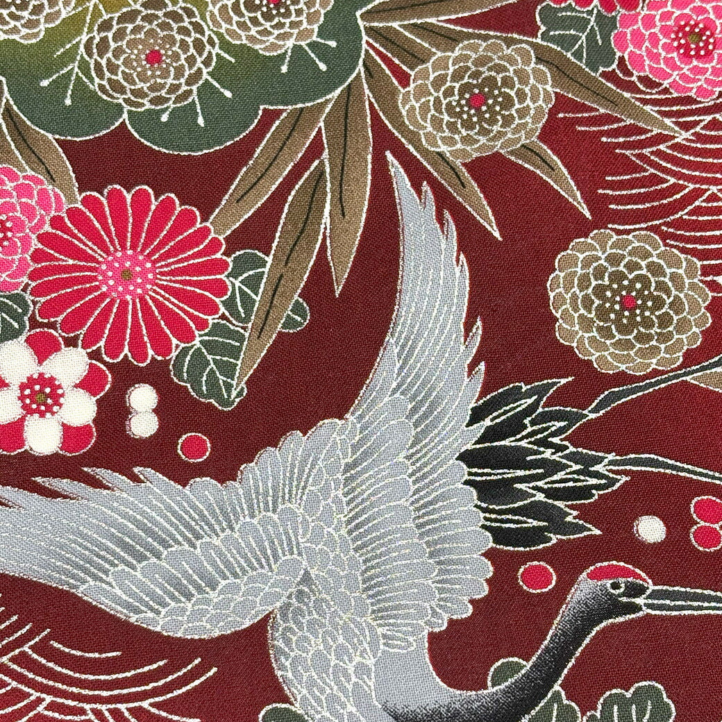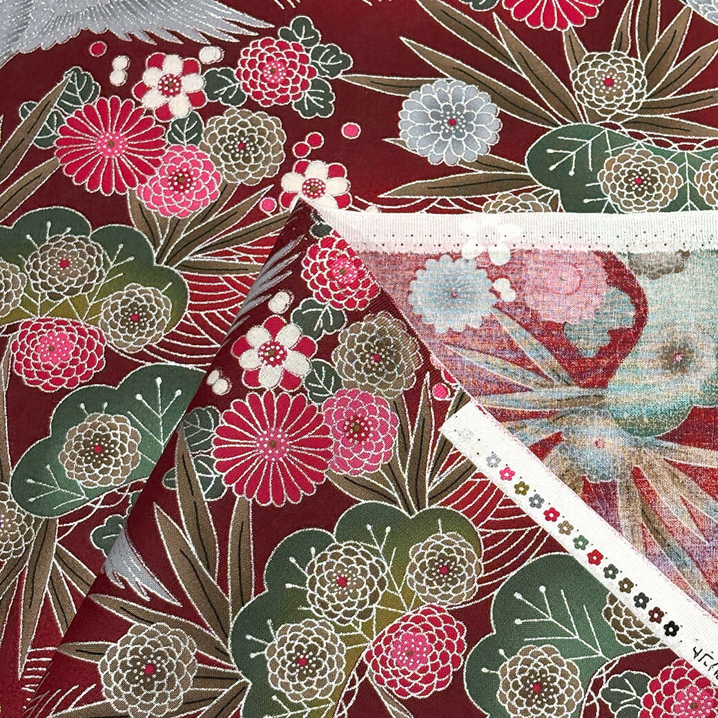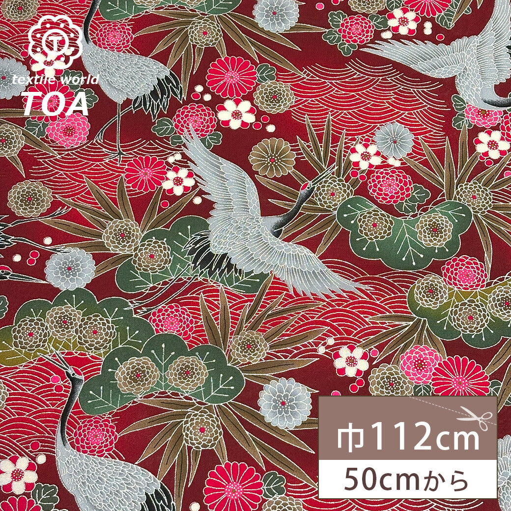 生地【 和柄プリント 鶴 レッド 】 鶴 青海波 菊 竹 浴衣生地 和風生地 112cm巾 綿100% 和装 着物 浴衣 巾着 バッグ 和装小物 髪飾り 衣装 婚礼 袱紗 足袋入れ パッチワーク ハンドメイド 手芸 日本製 布 布地 Tex