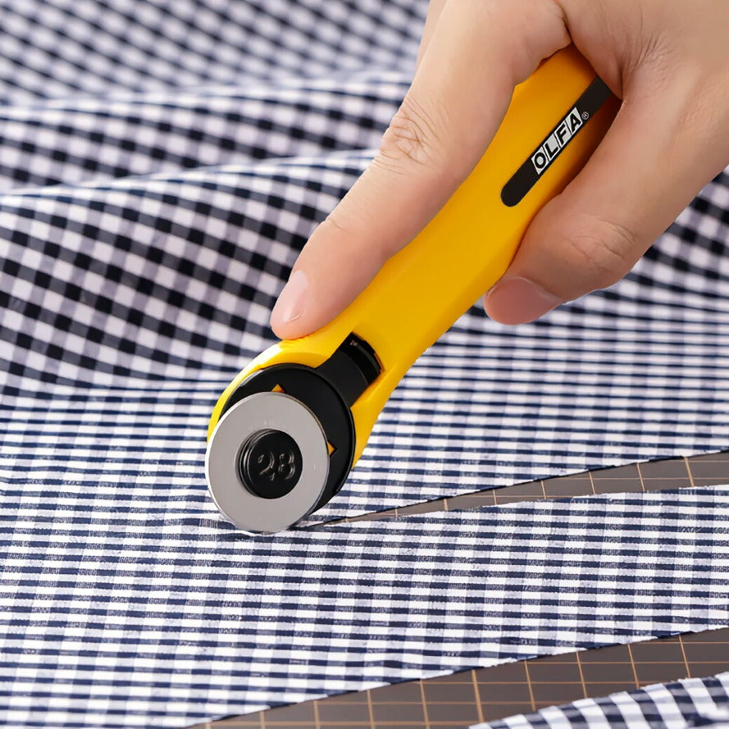小回りのきく直径28mm円形刃を装着したロータリーカッター。