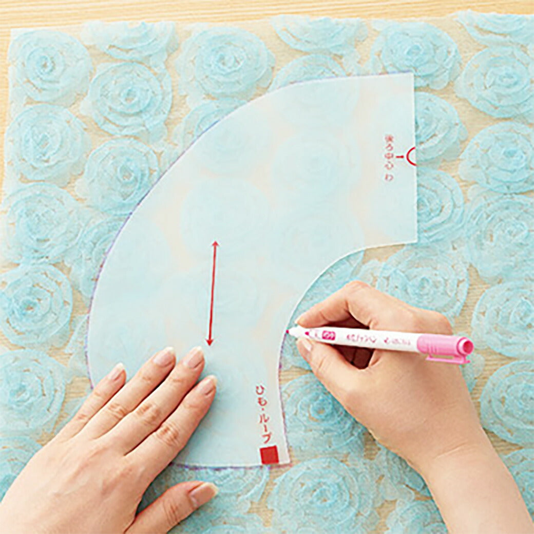 シリコーン製で重みのあるテンプレートなので、レース地などの布の上でも ズレにくく、安定したしるし付けができます。布柄が透けて見える テンプレートなので、好きな布の好きな部分で付け襟が作れます。