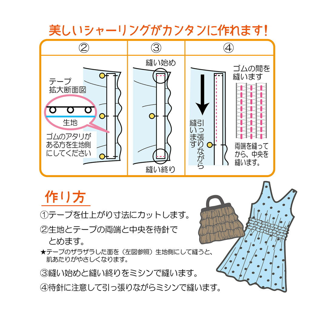 清原 【 サンコッコー シャーリングテープ ギャザリン 4コール 2m巻 SUN52-21 】 シャーリングゴム 袖ぐり 襟ぐり ゴムシャーリング ウエストゴム 伸縮性 伸縮ゴム ストレッチゴム ムームー アロハワンピース ワ