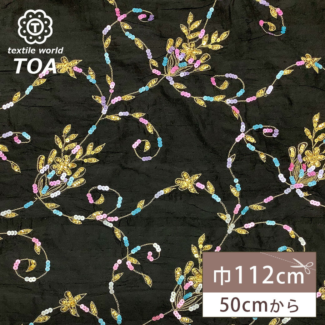 生地 【 シルク スパンコール ブラック 】 インドシルク 正絹 本絹 シルク生地 花柄 刺しゅう 刺繍生地 スパンコール キラキラ 民族衣装 サリー エスニック ベリーダンス アラブ衣装 伝統衣装 チョリ チュニック パンジャビ ダンス衣装 舞台衣装 Textile World TOA