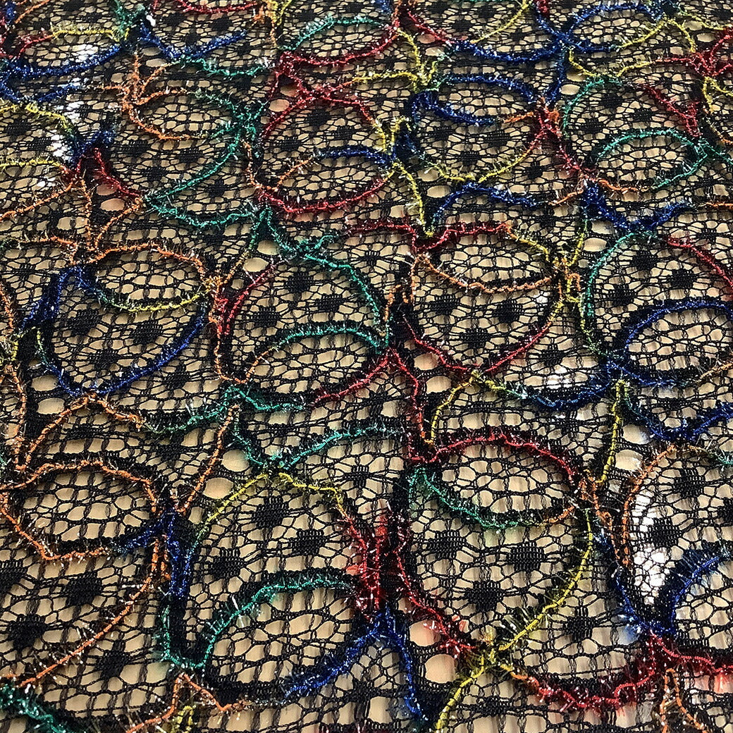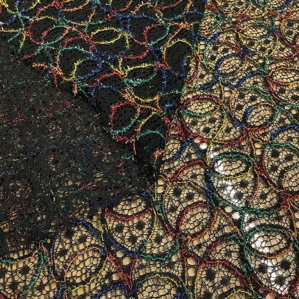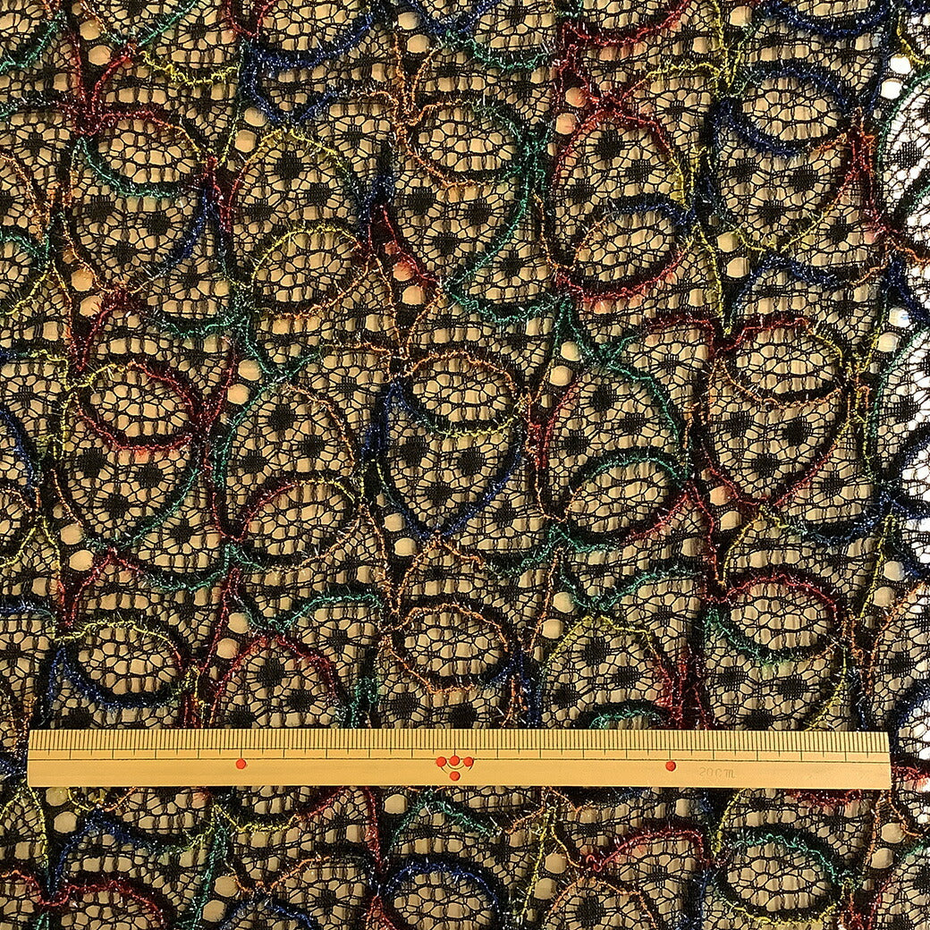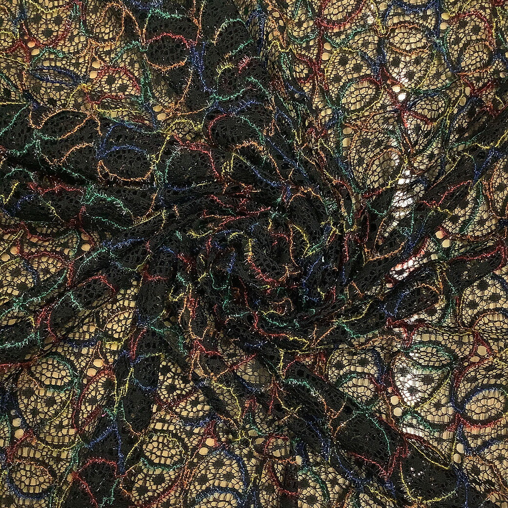 黒のレース生地にレインボーのキラキララメが入った個性的で目を引く生地。