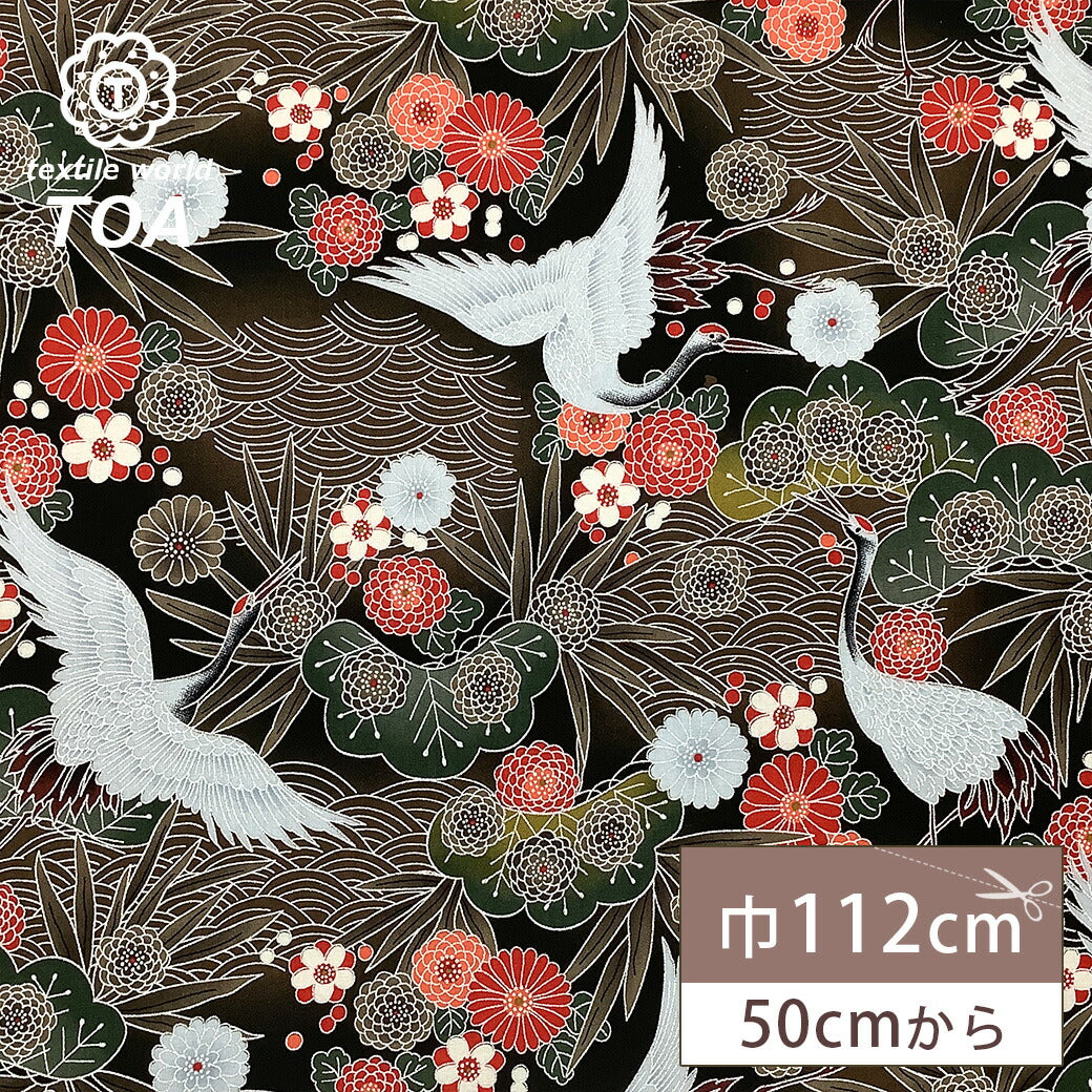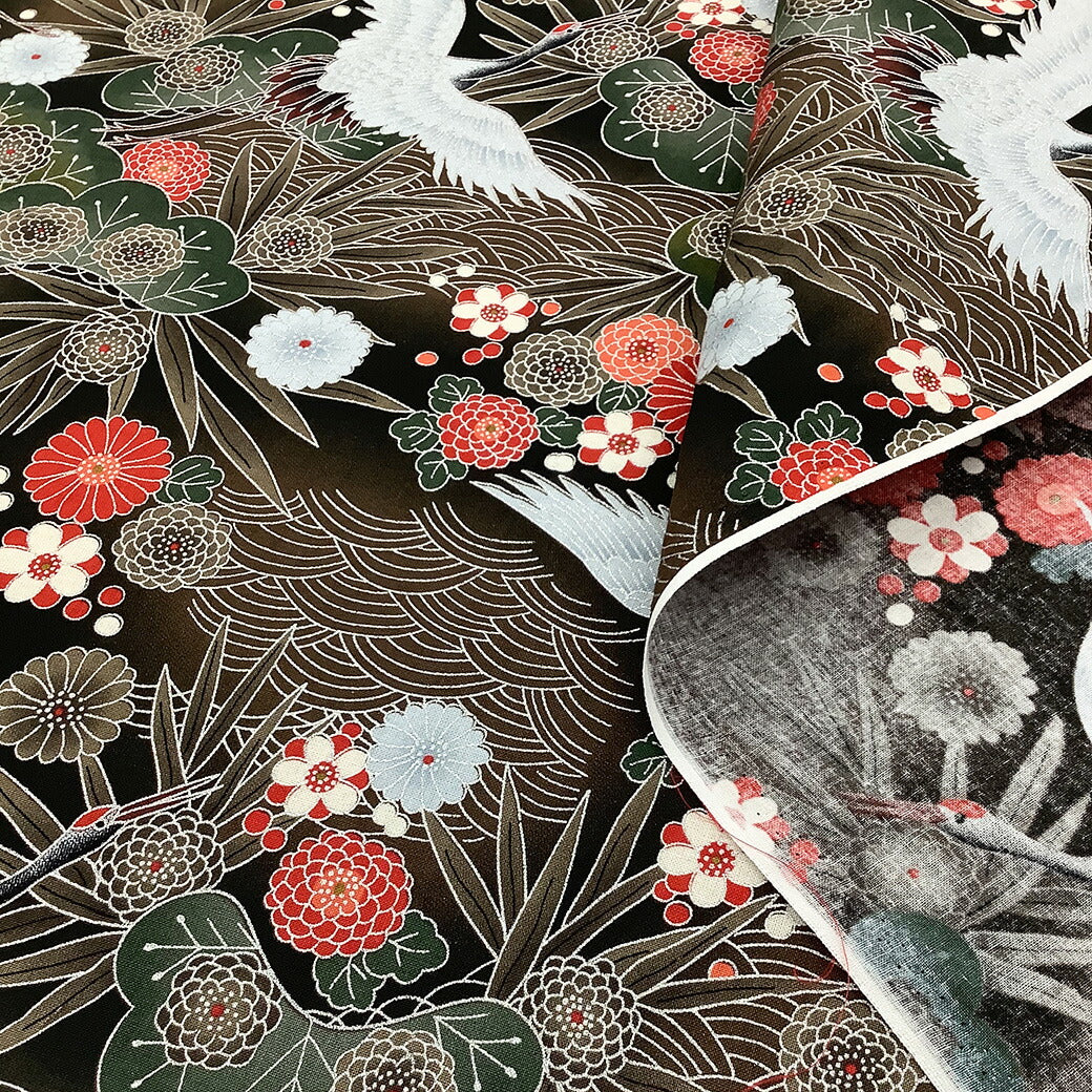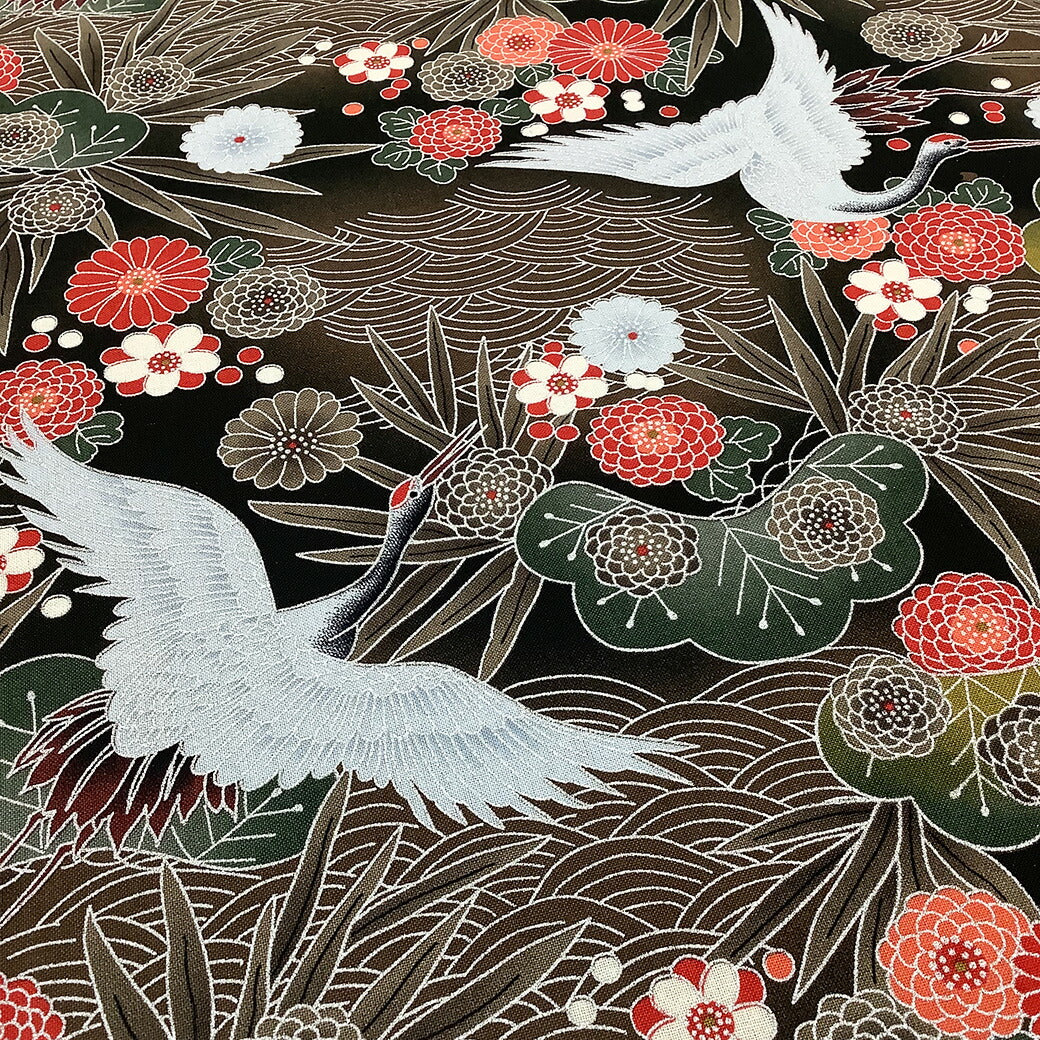 生地【 和柄プリント 鶴 ブラウン 】 鶴 青海波 菊 竹 浴衣生地 和風生地 112cm巾 綿100% 和装 着物 浴衣 巾着 バッグ 和装小物 髪飾り 衣装 婚礼 袱紗 足袋入れ パッチワーク ハンドメイド 手芸 日本製 布 布地 Te