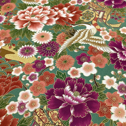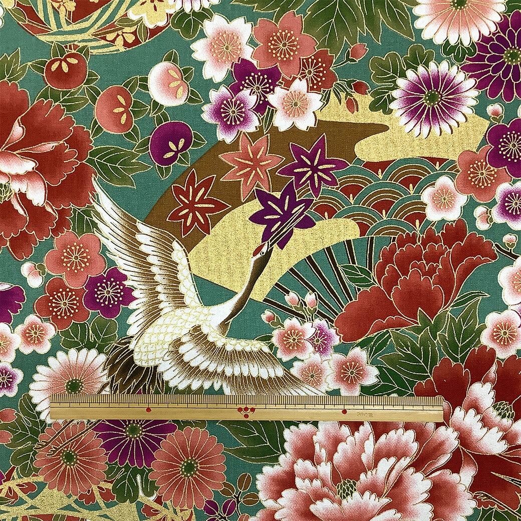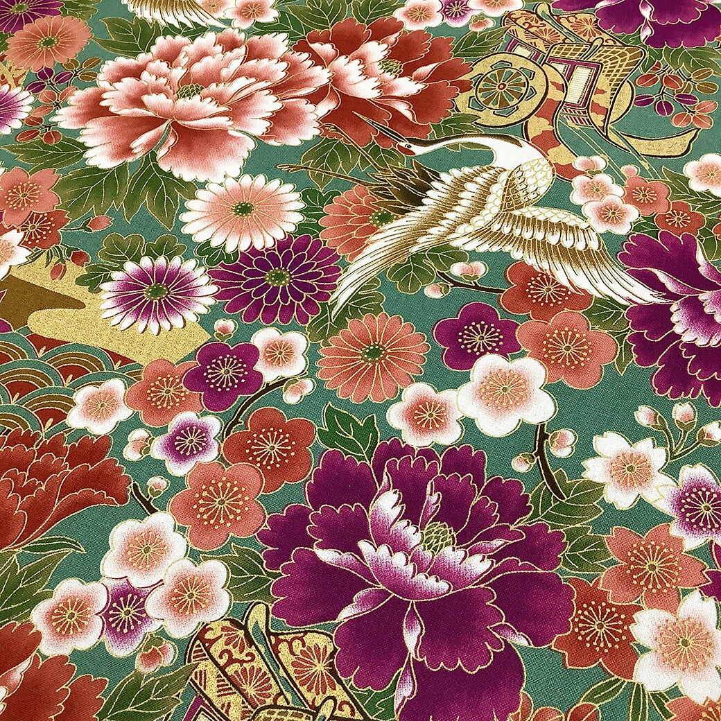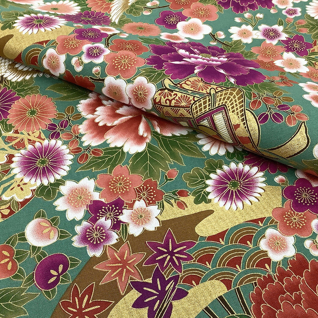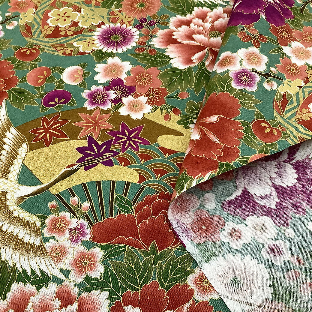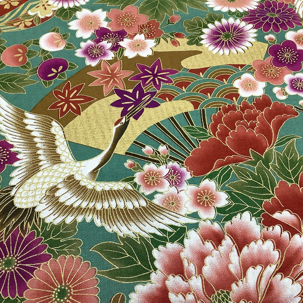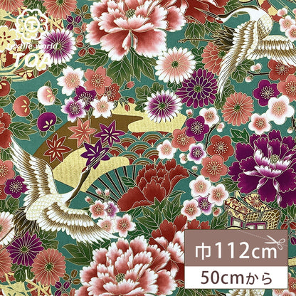 生地【 和柄プリント 鶴 グリーン 】 鶴 菊 牡丹 御所車 扇 浴衣生地 和風生地 112cm巾 綿100% 和装 着物 浴衣 巾着 バッグ 和装小物 髪飾り 衣装 婚礼 袱紗 足袋入れ パッチワーク ハンドメイド 手芸 日本製 布 布地 Textile World TOA