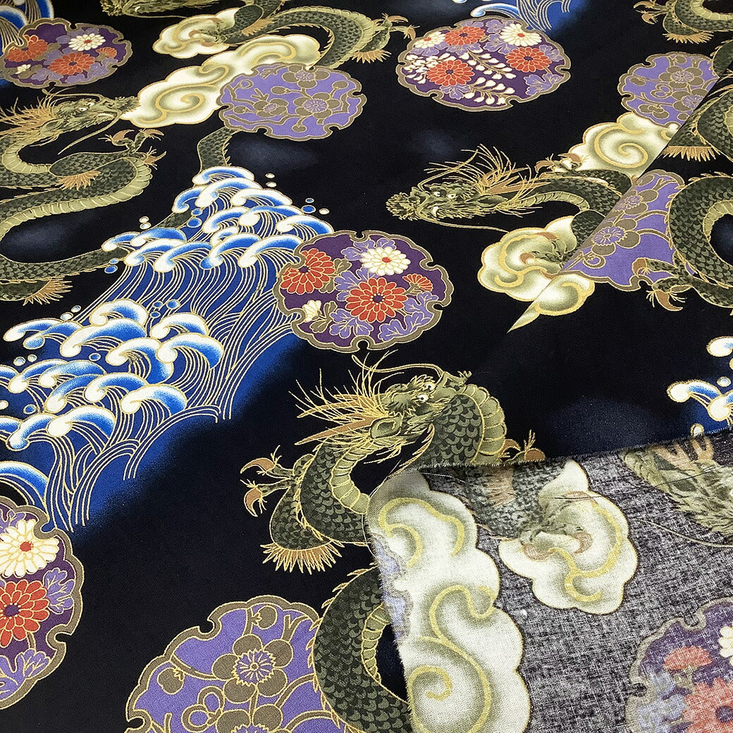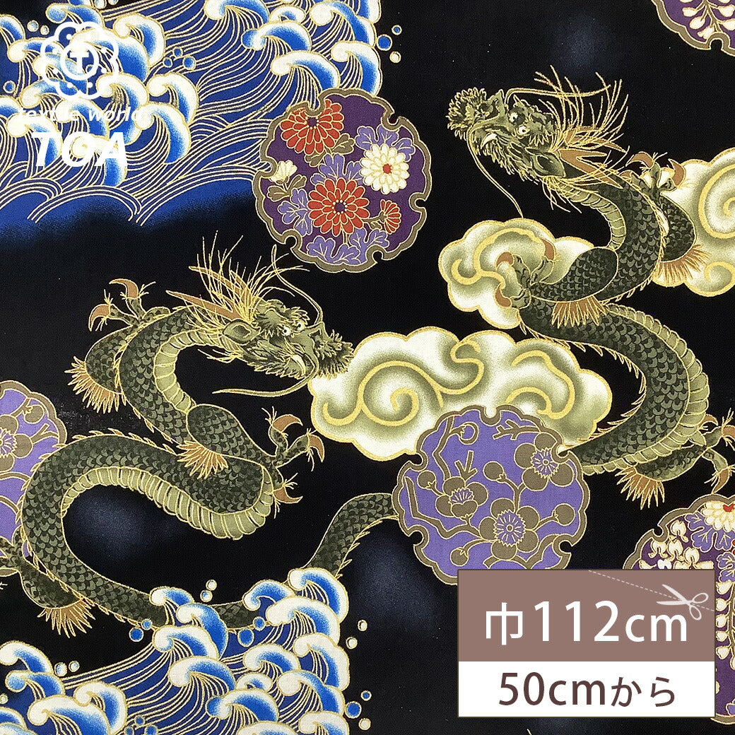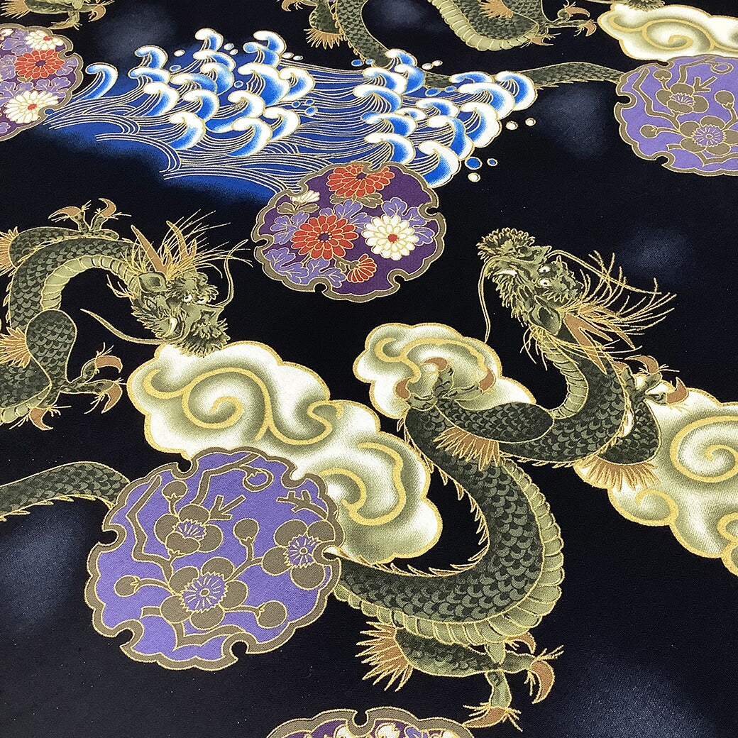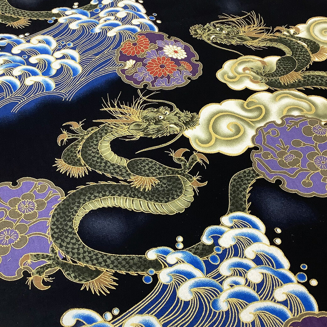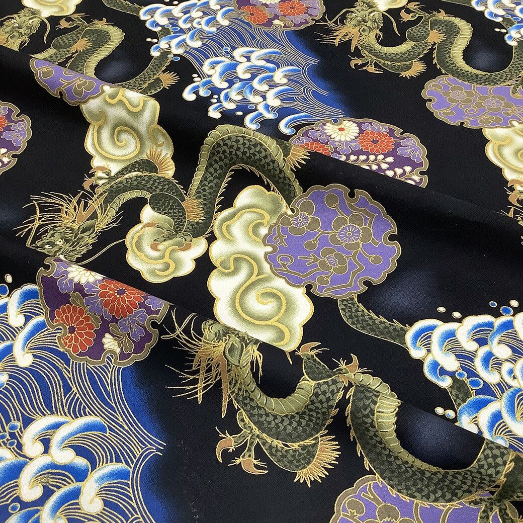 生地 【 和柄プリント 龍 ブラック 】 昇龍 龍神112cm巾 綿100%
