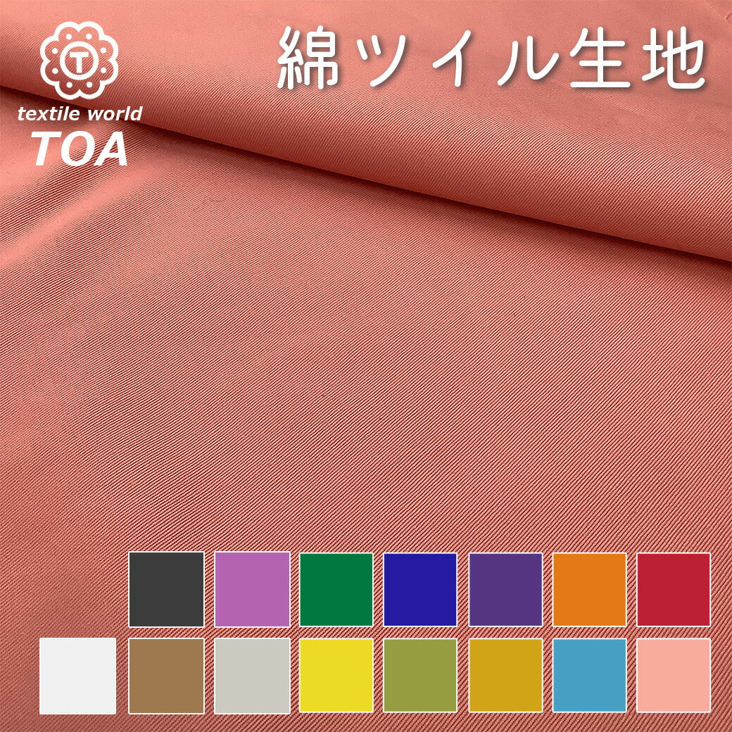 生地【 綿ツイル生地 15色 】 ツイル生地 コットンツイル 112cm巾 綿100% 綿ツイル 無地 定番 カラーツイル バッグ 雑貨 小物 インテリア 入園 入学 幼稚園 保育園 新学期 新生活 入園グッズ ハンドメイド Textile World TOA