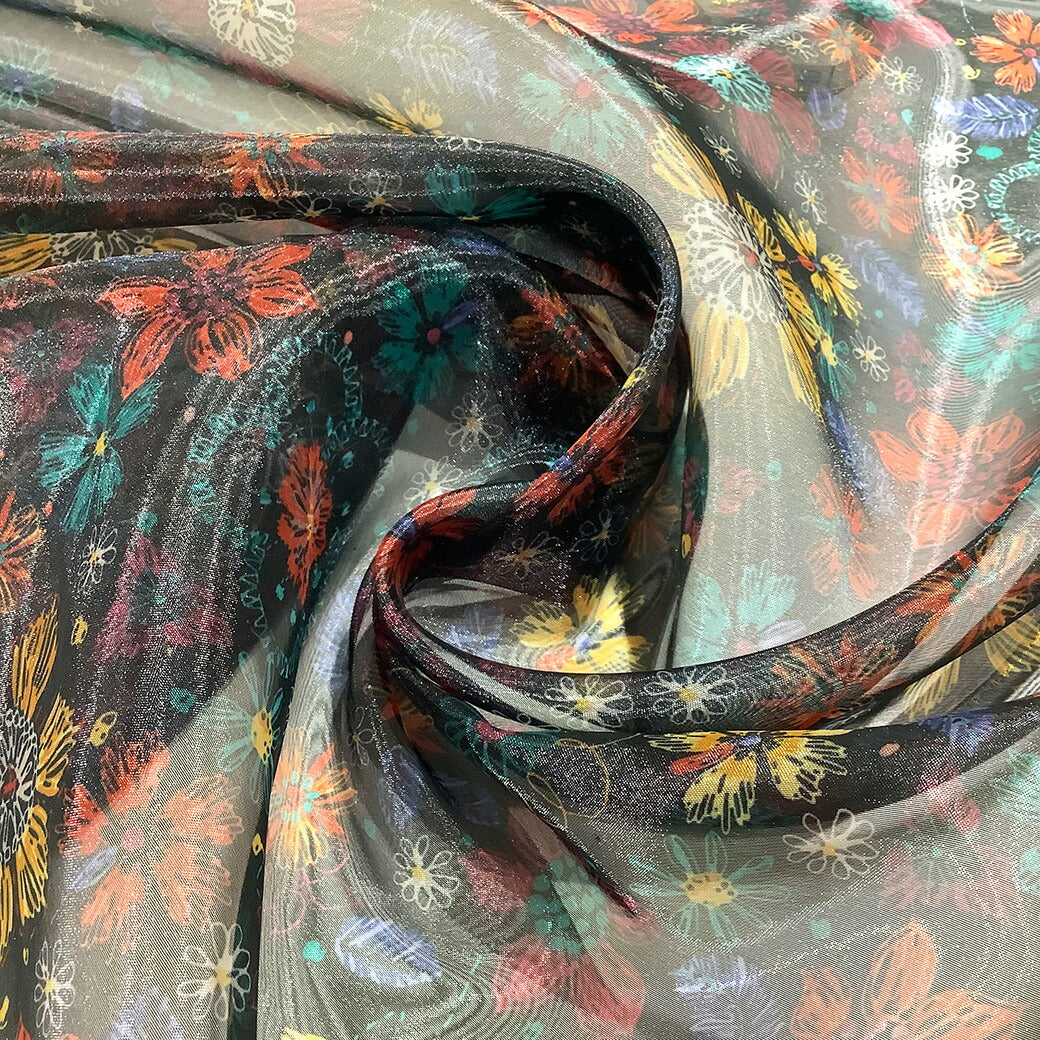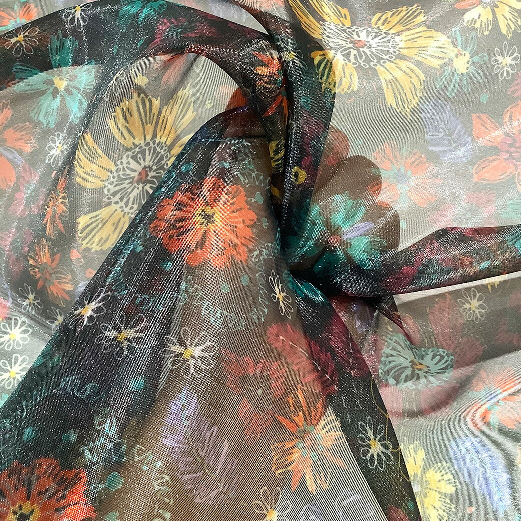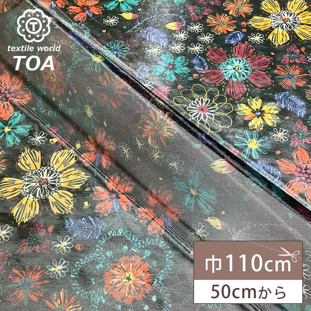 生地 【 オーガンジープリント 花柄 】 オーガンジー 生地 柄 プリントオーガンジー 花柄 手描き風 イラスト フラワープリント エレガント ブラウス ワンピース スカート 発表会 衣装 卒業制作 衣装作り ダンス衣装 インテリア ブラック オレンジ 黄色 緑 Textile World TOA