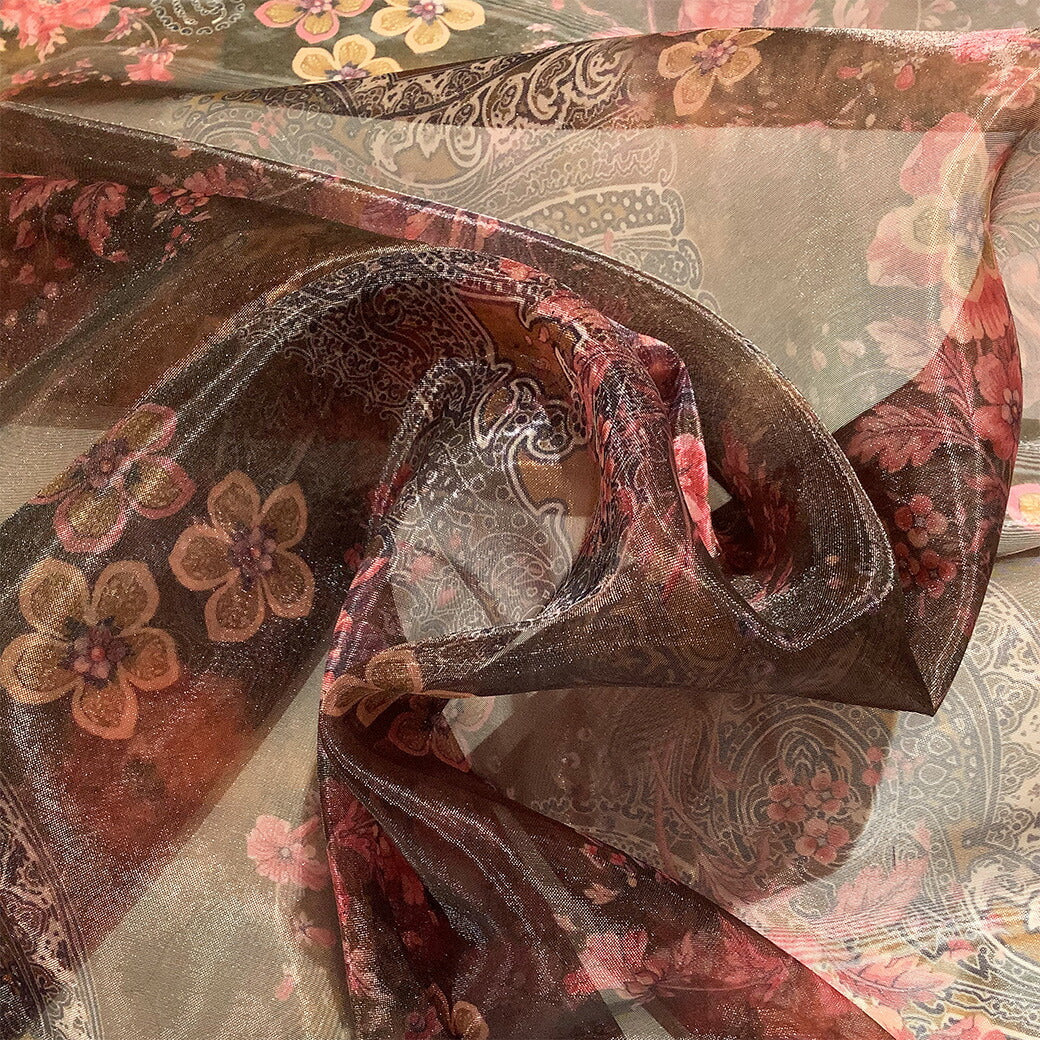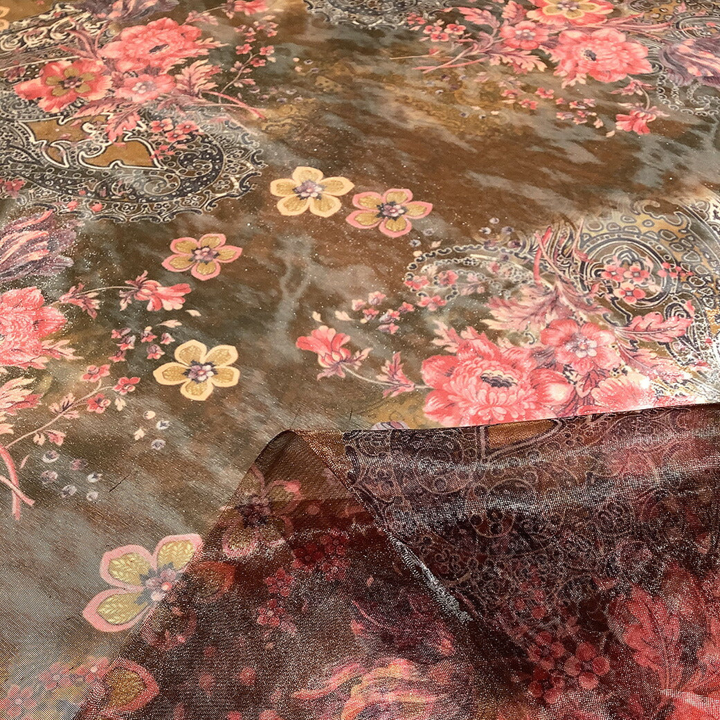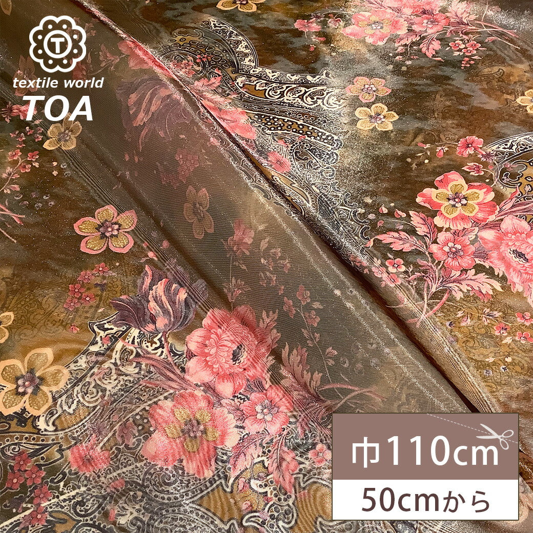 生地 【 オーガンジープリント 花柄 】 オーガンジー 生地 プリントオーガンジー 牡丹 ペイズリー 幾何学模様 ぼたん エスニック エレガント ブラウス ワンピース スカート 発表会 衣装 卒業制作 衣装作り ダンス衣装 インテリア ブラウン 茶色 ピンク Textile World TOA