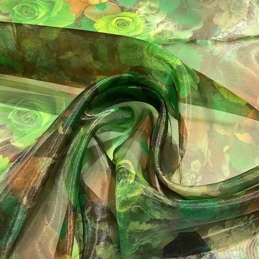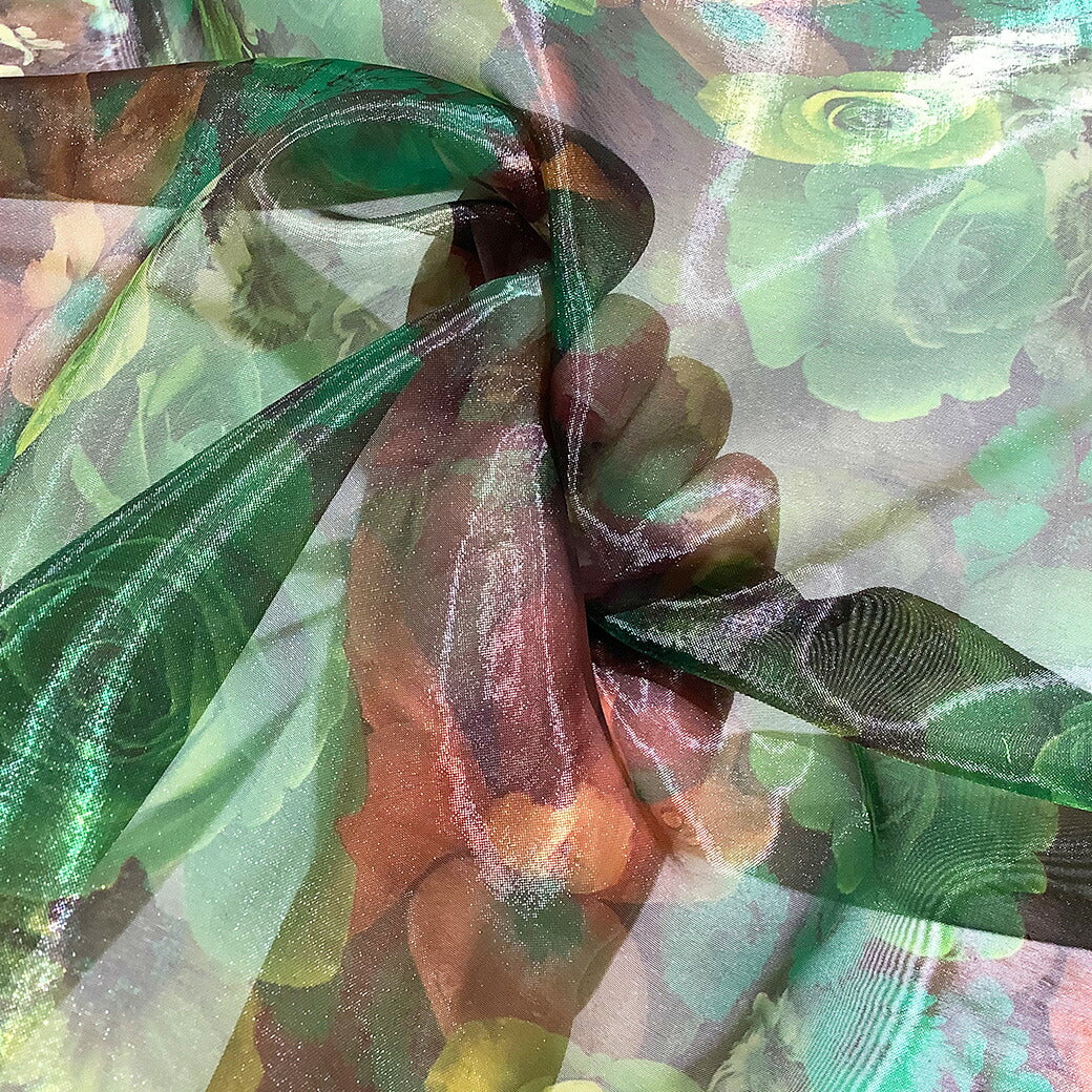 薔薇の花のプリントとグリーンカラーがエレガントなオーガンジー。