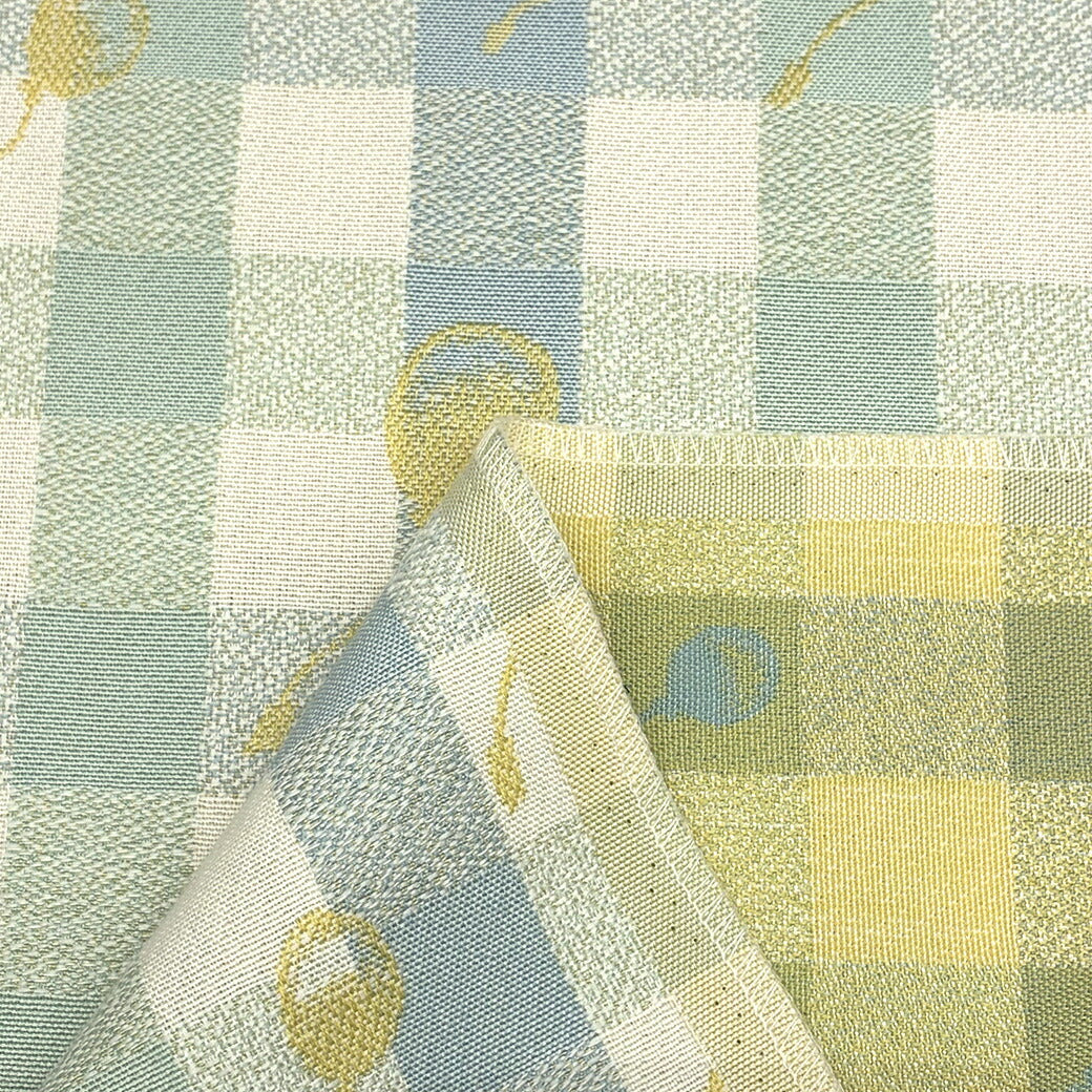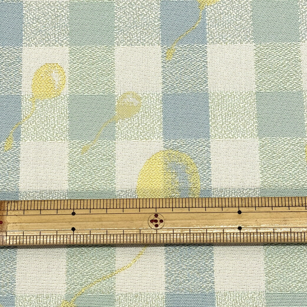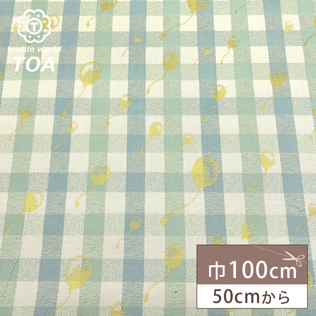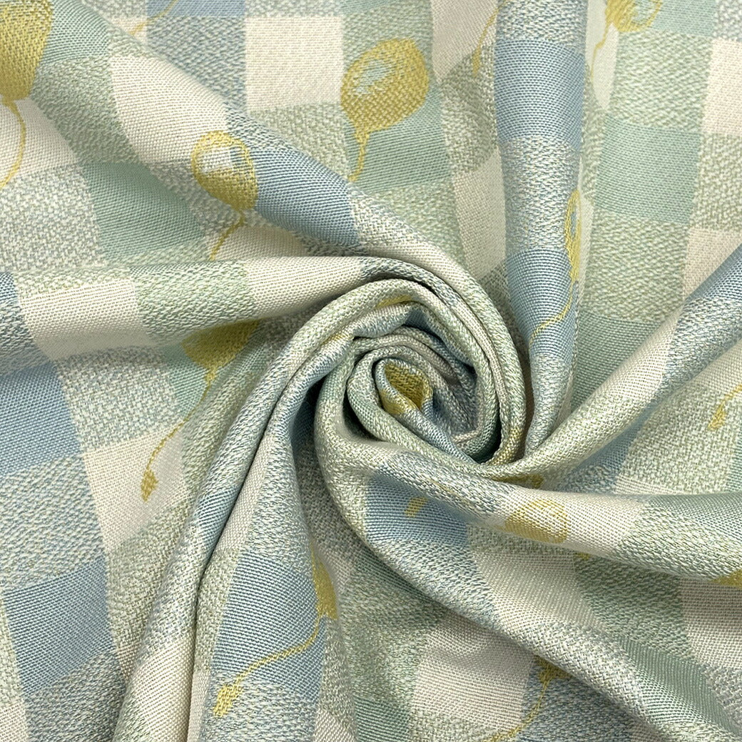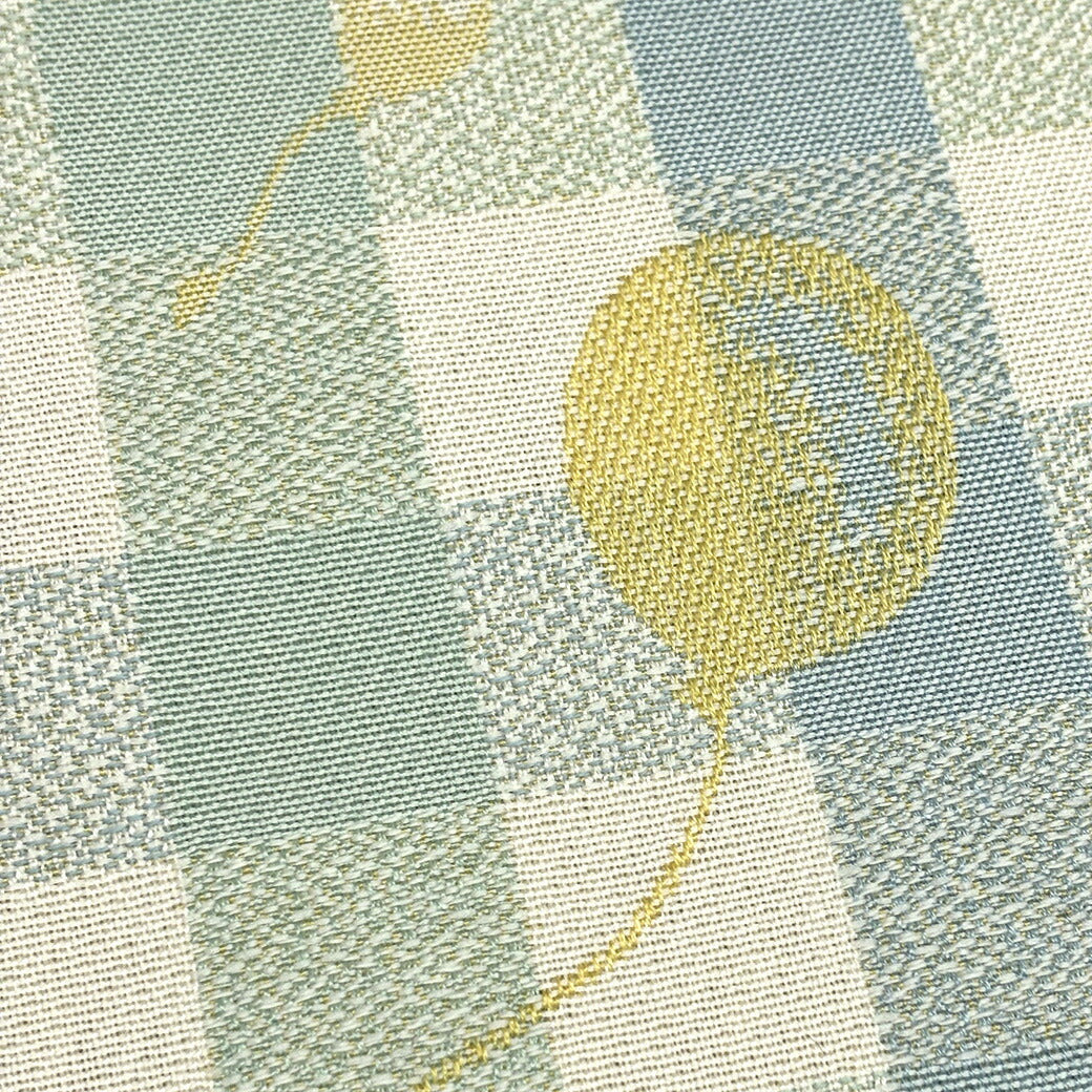 ギンガムチェック柄のベースに、風船モチーフをジャガード織りで散りばめた可愛らしい生地です。
