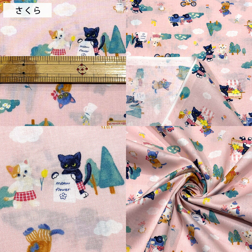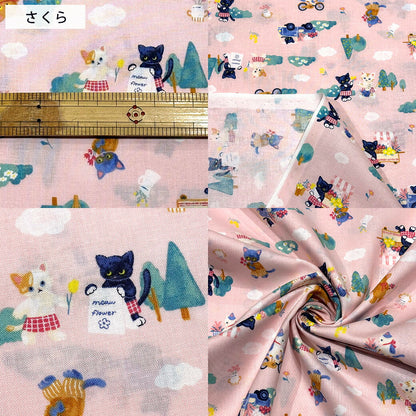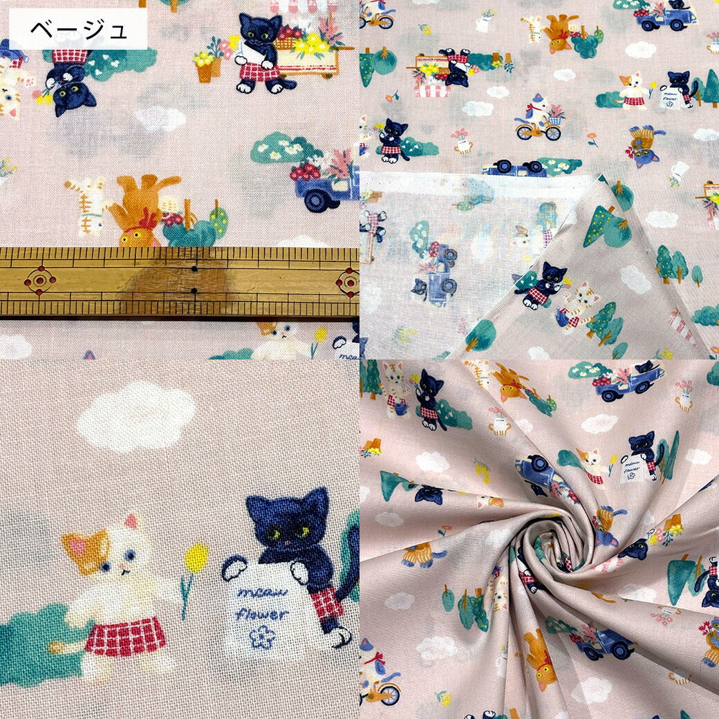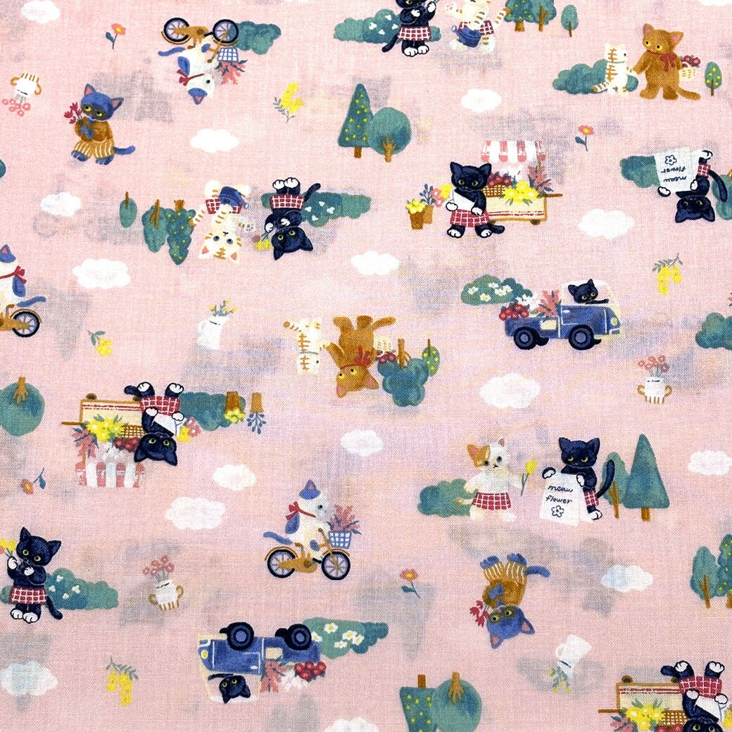 可愛い猫たちの姿が描かれたメルヘンなシーチング生地
