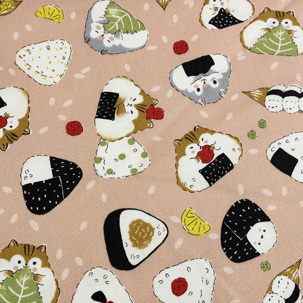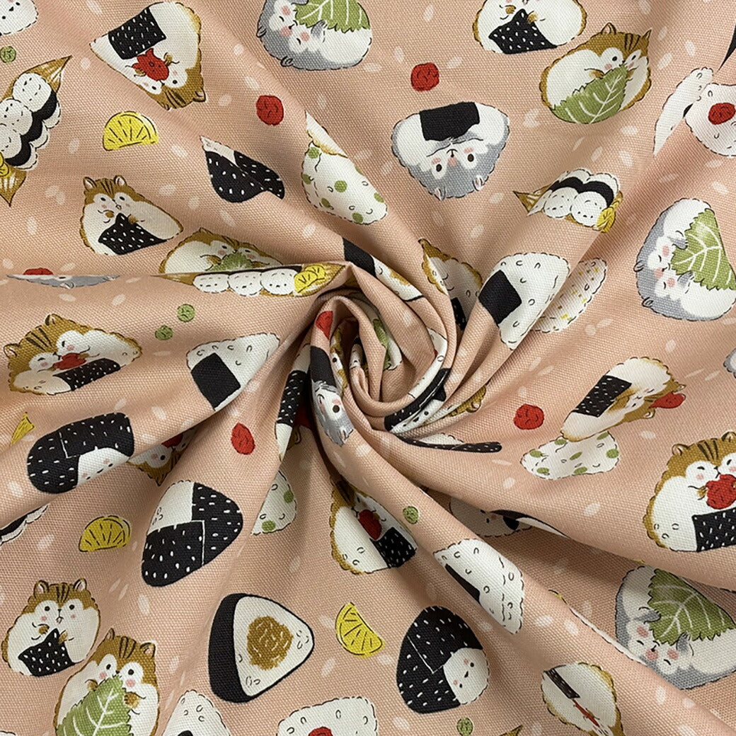 生地 【 Delicious Animal ピンク 】 おにぎり ハムスター シマエナガ リス たべもの柄 どうぶつ柄 動物柄 オックス生地 綿生地 キャラクター 入園 入学 新学期準備 幼稚園 可愛い レッスンバッグ 習い事