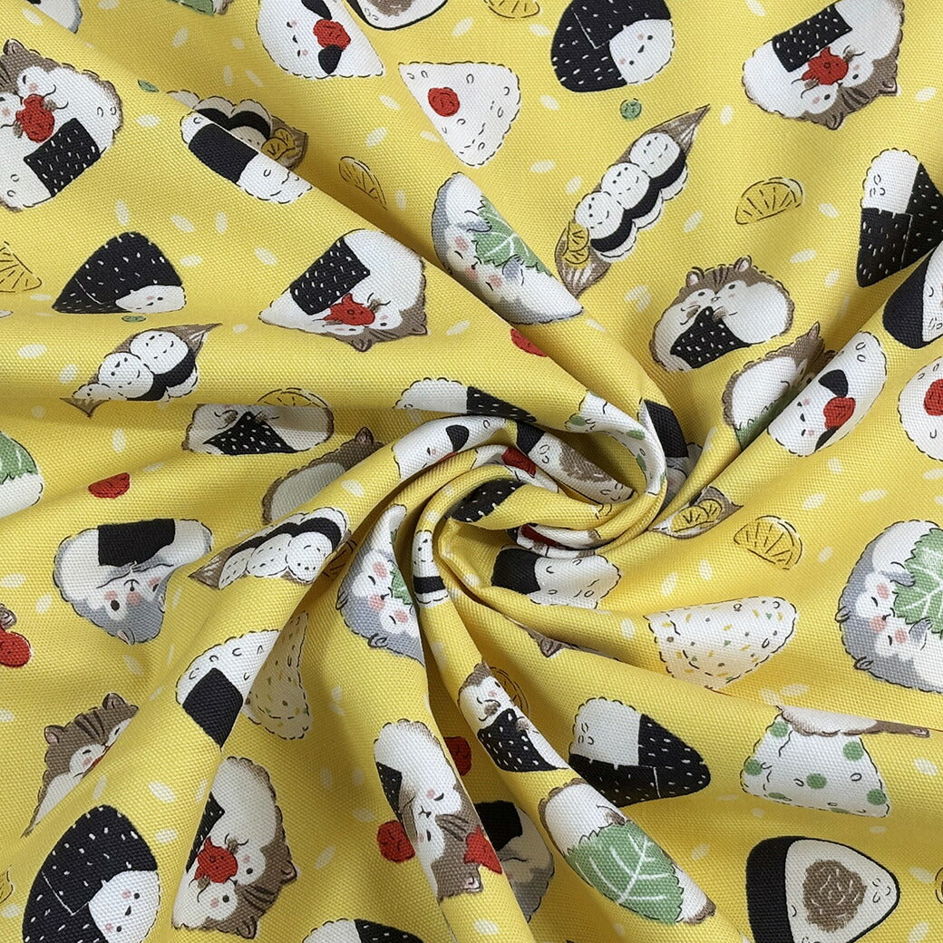 生地 【 Delicious Animal イエロー 】 おにぎり ハムスター シマエナガ リス たべもの柄 どうぶつ柄 動物柄 オックス生地 綿生地 キャラクター 入園 入学 新学期準備 幼稚園 可愛い レッスンバッグ 習い
